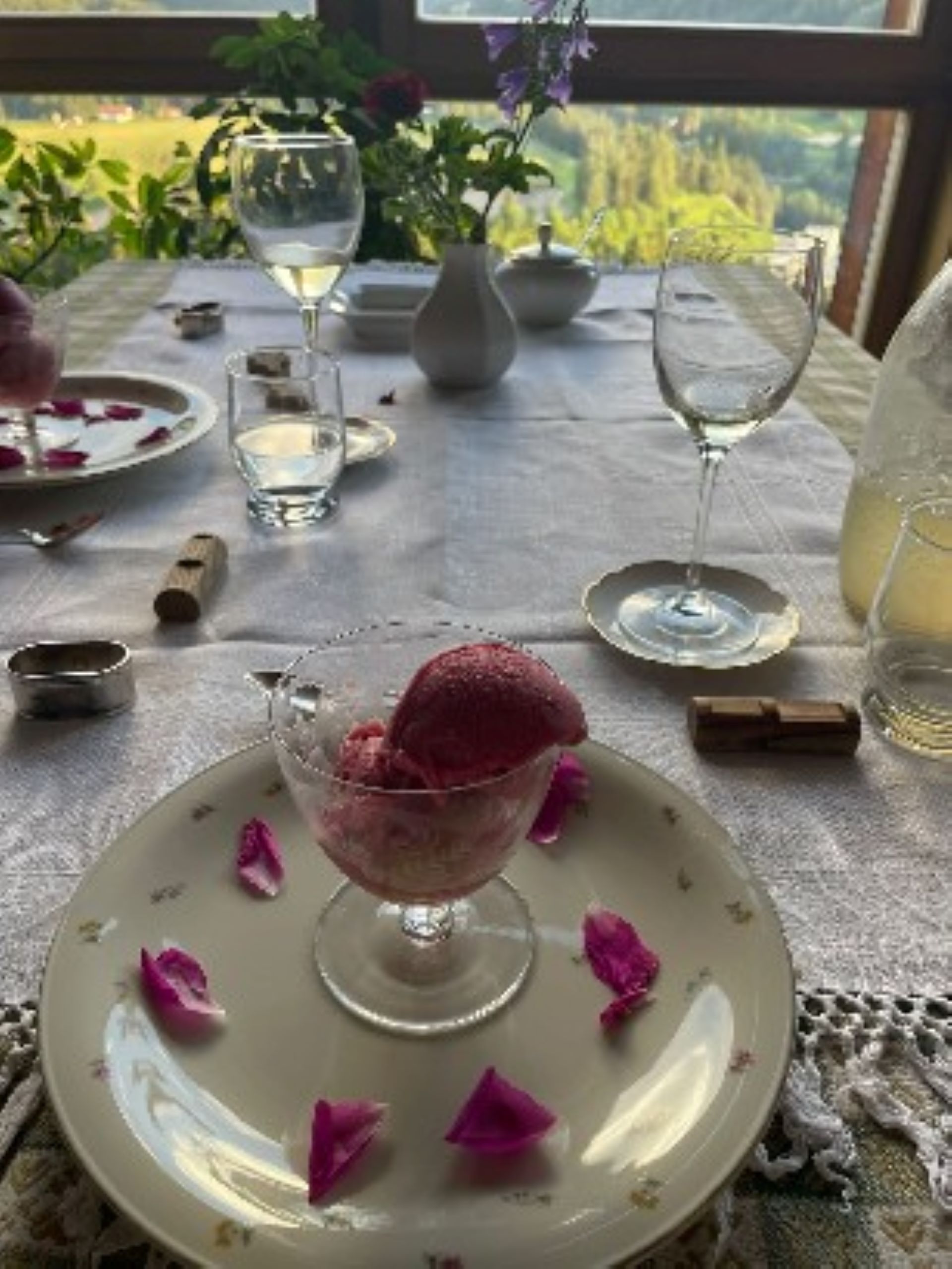 Di solito la mamma cucina in anticipo diversi piatti sul fornello a legna del suo appartamento, che poi prepara o riscalda semplicemente nella cucina della zona ospiti. Che si tratti di cibo vegano, vegetariano, senza glutine o normale, mia madre ne sa molto, perché ha fatto molti corsi di formazione, tra cui quello di erborista.